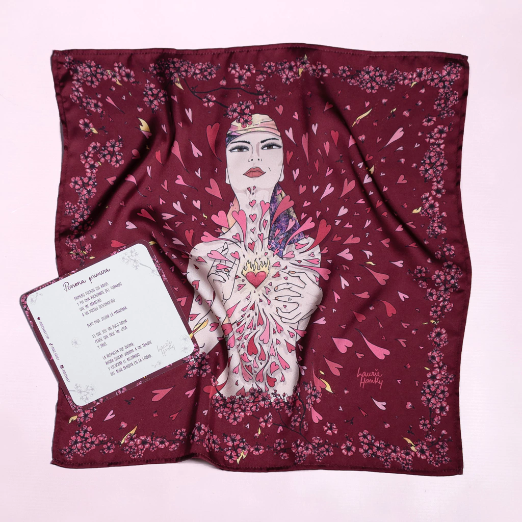 El pañuelo pequeño (45 x 45 cm), viene en un sobre de papel madera que incluye la postal con su poema. Divino.