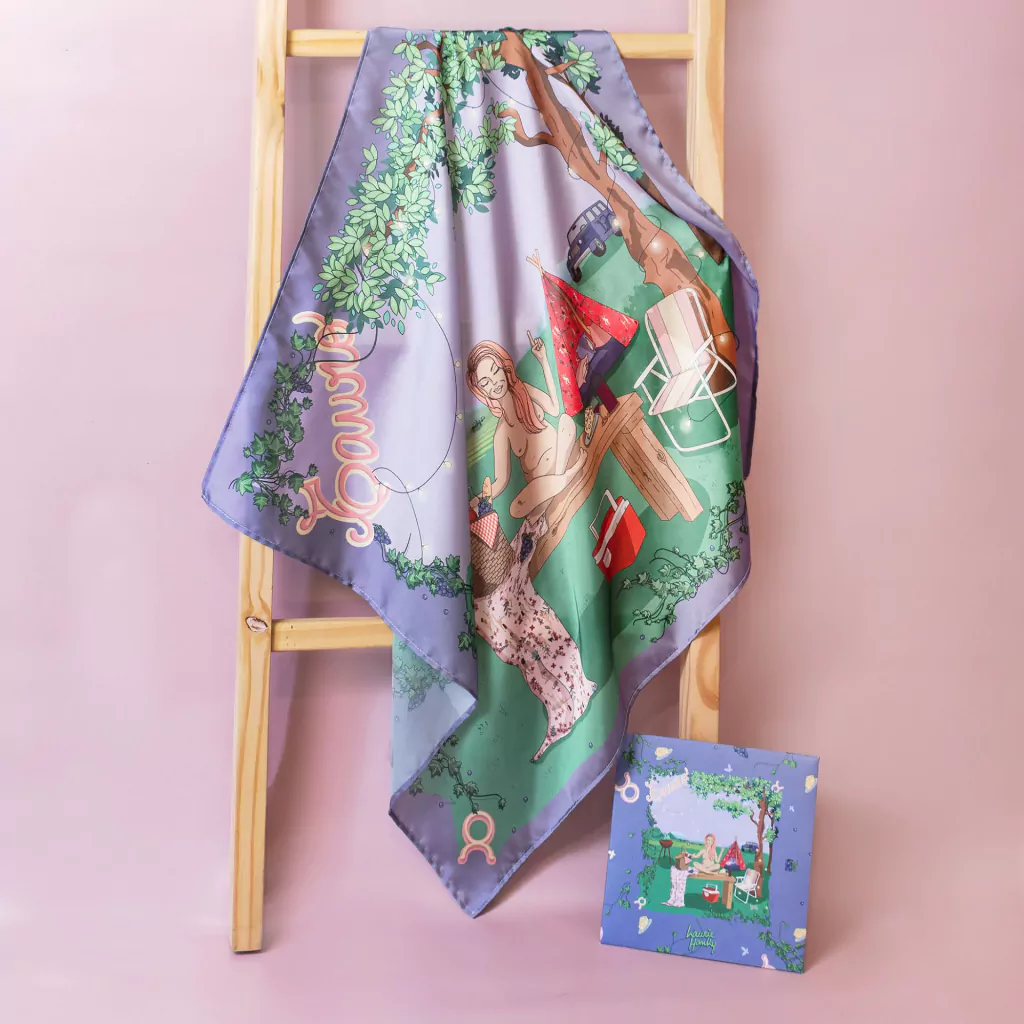El pañuelo pequeño (45 x 45 cm), viene en un sobre de papel madera que incluye la postal con su poema. Divino.