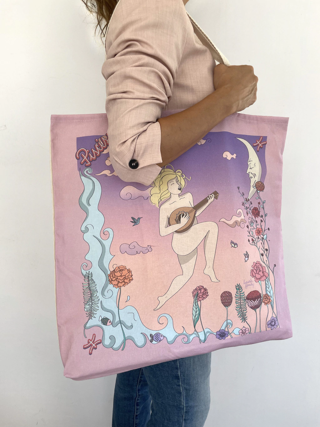 Tote bag Piscis. Bolsa de lienzo de algodón estampada en el frente de forma digital. Mide 43 x 45 cm. aproximadamente (b x h). Las correas son de cinta sarga de algodón color crudo y miden, de largo, al medio, 13 cm. aproximadamente. Tiene bolsillo interno y una cinta para que ates las llaves ;)